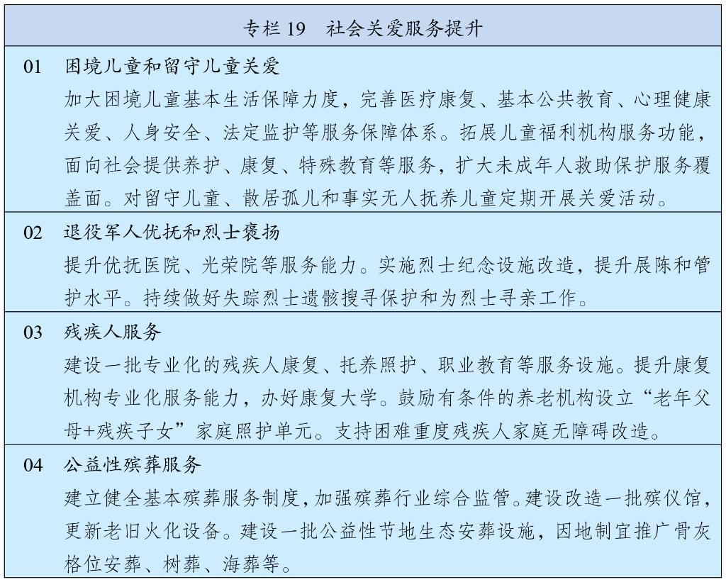 完善殘疾人社會(huì)保障制度和關(guān)愛服務(wù)體系,促進(jìn)殘疾人事業(yè)全面發(fā)展。強(qiáng)化對(duì)重度殘疾、多重殘疾、一戶多殘等群體兜底保障,健全困難殘疾人生活補(bǔ)貼、重度殘疾人護(hù)理補(bǔ)貼制度及補(bǔ)貼標(biāo)準(zhǔn)動(dòng)態(tài)調(diào)整機(jī)制,加強(qiáng)殘疾兒童康復(fù)救助,健全殘疾人輔助器具適配補(bǔ)貼制度。完善殘疾人社區(qū)和家庭支持,加強(qiáng)重度殘疾人托養(yǎng)照護(hù),發(fā)展精神障礙社區(qū)康復(fù)。強(qiáng)化殘疾人就業(yè)幫扶,完善按比例就業(yè)、集中就業(yè)、自主就業(yè)促進(jìn)機(jī)制。發(fā)展殘疾人文化體育。深入推進(jìn)科技助殘,加強(qiáng)公共設(shè)施、信息交流、社會(huì)服務(wù)無障礙環(huán)境建設(shè)。