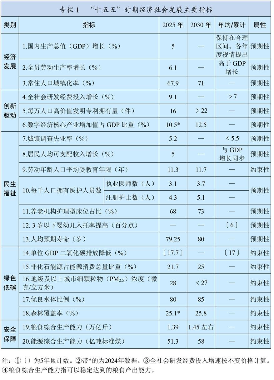 新發(fā)展理念引領(lǐng)作用全面彰顯,構(gòu)建新發(fā)展格局邁出重要步伐,新質(zhì)生產(chǎn)力穩(wěn)步發(fā)展,高質(zhì)量發(fā)展扎實(shí)推進(jìn)。經(jīng)濟(jì)運(yùn)行穩(wěn)中有進(jìn),國內(nèi)生產(chǎn)總值突破140萬億元,現(xiàn)代化產(chǎn)業(yè)體系建設(shè)取得重大進(jìn)展,基礎(chǔ)設(shè)施支撐能力不斷提升,數(shù)字經(jīng)濟(jì)核心產(chǎn)業(yè)增加值占比超過10.5%,城鄉(xiāng)區(qū)域發(fā)展平衡性協(xié)調(diào)性增強(qiáng)??萍紕?chuàng)新成果豐碩,全社會(huì)研發(fā)經(jīng)費(fèi)投入強(qiáng)度達(dá)到2.8%,攻克一批重大關(guān)鍵核心技術(shù),取得一批重大原創(chuàng)科技成果。全面深化改革進(jìn)一步推進(jìn),落實(shí)“兩個(gè)毫不動(dòng)搖”的體制機(jī)制不斷完善,全國統(tǒng)一大市場建設(shè)取得積極成效,宏觀經(jīng)濟(jì)治理效能進(jìn)一步提升。高水平對(duì)外開放不斷擴(kuò)大,開放型經(jīng)濟(jì)新體制加快形成,高質(zhì)量共建“一帶一路”走深走實(shí)。全過程人民民主深入發(fā)展,全面依法治國有效實(shí)施。文化事業(yè)和文化產(chǎn)業(yè)蓬勃發(fā)展,精神文化產(chǎn)品豐富多彩。民生保障扎實(shí)穩(wěn)固,居民人均可支配收入年均增長5.4%,城鎮(zhèn)新增就業(yè)累計(jì)達(dá)到6242萬人,勞動(dòng)年齡人口平均受教育年限達(dá)到11.3年,人均預(yù)期壽命提升至79歲以上,脫貧攻堅(jiān)成果鞏固拓展。綠色低碳轉(zhuǎn)型步伐加快,生態(tài)環(huán)境質(zhì)量持續(xù)改善,非化石能源發(fā)電裝機(jī)容量超過化石能源,地級(jí)及以上城市細(xì)顆粒物(PM2.5)濃度降至28微克/立方米,地表水達(dá)到或好于Ⅲ類水體比例超過90%,森林覆蓋率超過25%。國家安全能力有效提升,糧食產(chǎn)量邁上1.4萬億斤大臺(tái)階,社會(huì)治理效能增強(qiáng),社會(huì)大局保持穩(wěn)定。國防和軍隊(duì)建設(shè)取得重大進(jìn)展。“一國兩制”實(shí)踐深入推進(jìn)。中國特色大國外交全面拓展。全面從嚴(yán)治黨成效顯著,反腐敗斗爭縱深推進(jìn),黨的創(chuàng)造力、凝聚力、戰(zhàn)斗力明顯提高。