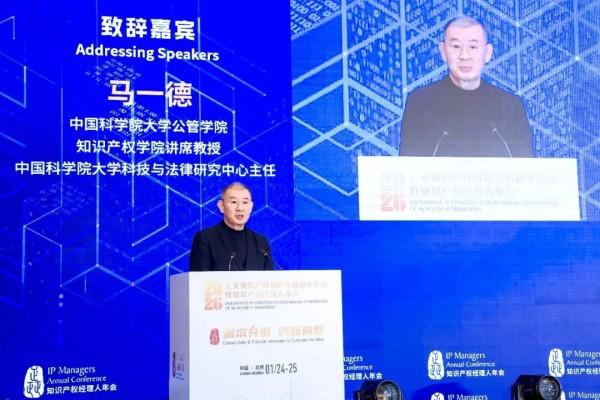 1月24日至25日,2026年知識(shí)產(chǎn)權(quán)戰(zhàn)略發(fā)展新年論壇暨知識(shí)產(chǎn)權(quán)經(jīng)理人年會(huì)在北京舉行。在開幕式上,中國(guó)科學(xué)院大學(xué)公共政策與管理學(xué)院、知識(shí)產(chǎn)權(quán)學(xué)院講席教授、中國(guó)科學(xué)院大學(xué)科技與法律研究中心主任馬一德發(fā)表致辭。他在回顧并反思知識(shí)產(chǎn)權(quán)學(xué)科與制度所面臨的深刻挑戰(zhàn)后,呼吁當(dāng)代中國(guó)知識(shí)產(chǎn)權(quán)人努力繼承和發(fā)揚(yáng)中國(guó)知識(shí)產(chǎn)權(quán)學(xué)科奠基人劉春田教授的擔(dān)當(dāng)精神、學(xué)術(shù)風(fēng)骨與責(zé)任意識(shí)。