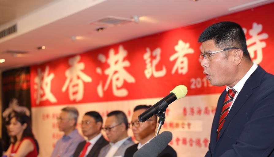 8月15日,香港福建社團(tuán)聯(lián)會副主席蔡建四在會上宣讀這些社團(tuán)發(fā)表的聯(lián)署聲明《反暴力 救香港》。 新華社記者 吳曉初 攝