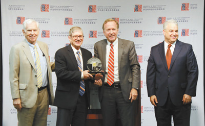 圖為6月12日,尼爾·布什(左三)在亞特蘭大為美國前總統(tǒng)卡特頒發(fā)首屆美中關系卓越領袖獎,其子詹姆斯·卡特(左二)代為領獎。