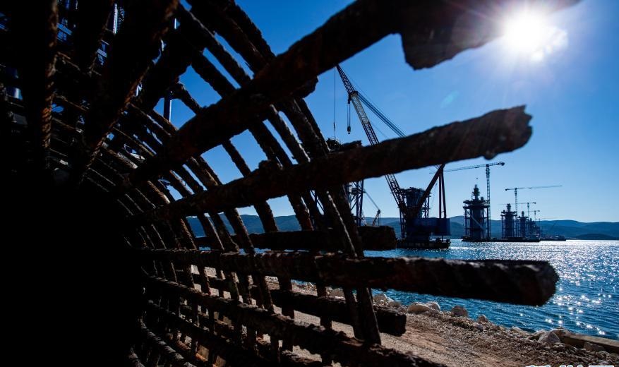 這是10月20日在克羅地亞南部拍攝的佩列沙茨跨海大橋施工現(xiàn)場。施工水域同時也是海豚的“游樂場”。2018年大橋開始施工至今,海豚并沒有受到打擾,它們在水中跳躍嬉戲的視頻不時出現(xiàn)在社交網(wǎng)絡(luò)上。新華社發(fā)(米蘭·薩比奇攝)