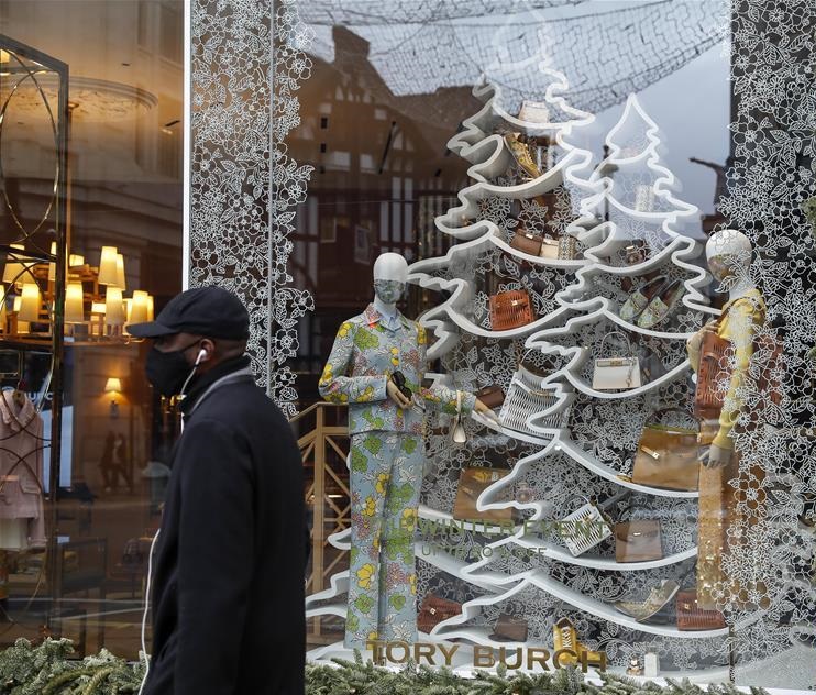 12月21日,一名戴口罩的男子從英國倫敦一家商鋪櫥窗里戴口罩的模特前走過。 圣誕節(jié)臨近,英國部分地區(qū)新冠病毒傳播速度加快,疫情令人擔(dān)憂。英國政府正在調(diào)查這一狀況是否與一種變異的新冠病毒有關(guān),并將首都倫敦、英格蘭東南部和東部部分地區(qū)的新冠疫情防控級(jí)別從第三級(jí)提升至新增加的第四級(jí)。 新華社記者 韓巖 攝