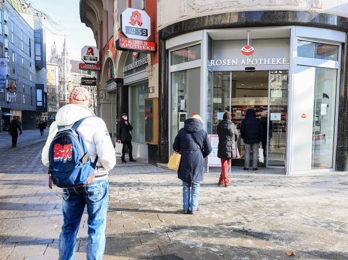 1月15日,在德國慕尼黑,人們排隊等候進(jìn)入一家藥店。