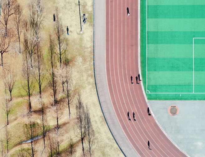 人民網(wǎng)訊 當(dāng)?shù)貢r(shí)間1月20日,韓國(guó)光州,冬日陽(yáng)光和煦,航拍韓國(guó)全南大學(xué)操場(chǎng)。