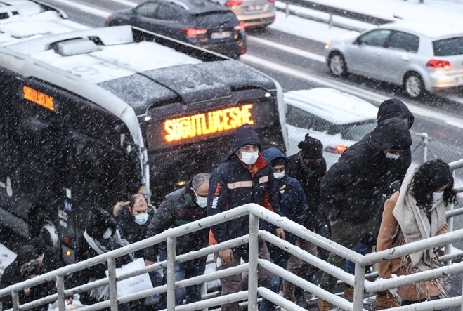 當(dāng)?shù)貢r(shí)間2月17日,土耳其伊斯坦布爾,人們戴著口罩行走在大雪中。(圖片來(lái)源:東方IC)