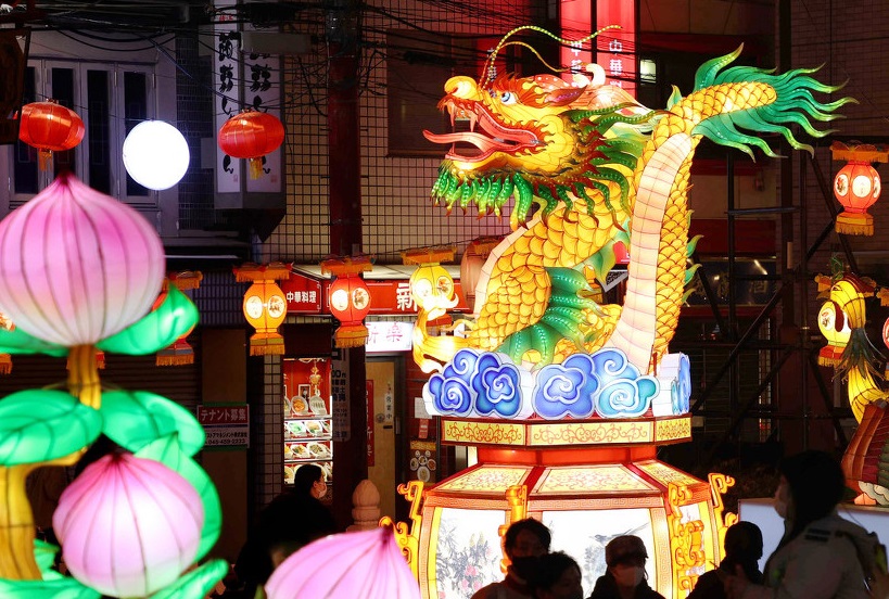人民網(wǎng)訊 當?shù)貢r間2月13日,為慶祝中國農(nóng)歷新年,日本橫濱中華街展出以中國文化為主題的花燈,為當?shù)貛硇麓旱南矐c氣息。