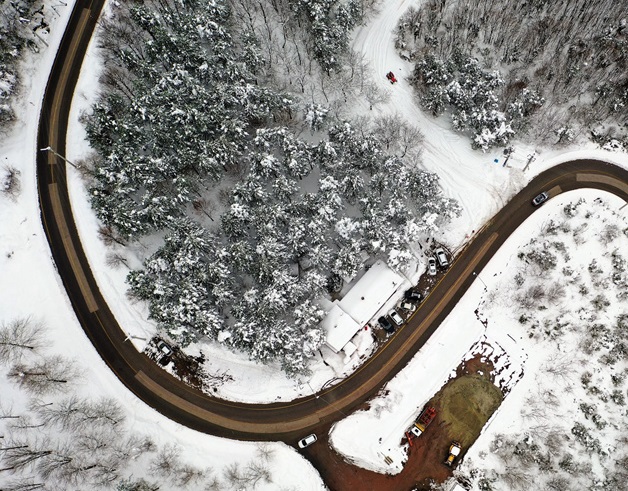 當(dāng)?shù)貢r(shí)間2月23日,土耳其科賈埃利,無(wú)人機(jī)航拍冬日雪景,車輛在蜿蜒的公路上行駛。(圖片來(lái)源:東方IC)