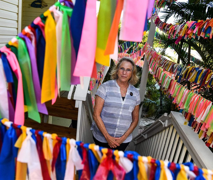 人民網(wǎng)訊 據(jù)媒體3月10日報(bào)道,美國佛羅里達(dá)州安娜瑪麗亞島,67歲的凱西·托拜厄斯(Cathy Tobias)在院子里系上絲帶,紀(jì)念新冠肺炎遇難者?,F(xiàn)在她的院子里有超過3萬條絲帶,從露臺(tái)、樓梯到陽臺(tái)都系滿了五顏六色的帶子,每一條代表著一位死于新冠肺炎的佛州人。