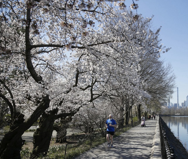 當(dāng)?shù)貢r(shí)間4月8日,美國(guó)紐約,中央公園里櫻花盛放,吸引游客觀賞。(圖片來(lái)源:東方IC)