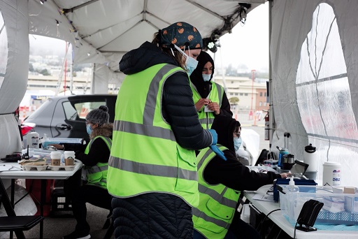 4月29日,在美國加利福尼亞州舊金山城市學(xué)院,工作人員在新冠疫苗接種點的帳篷里忙碌。(新華社記者吳曉凌攝)