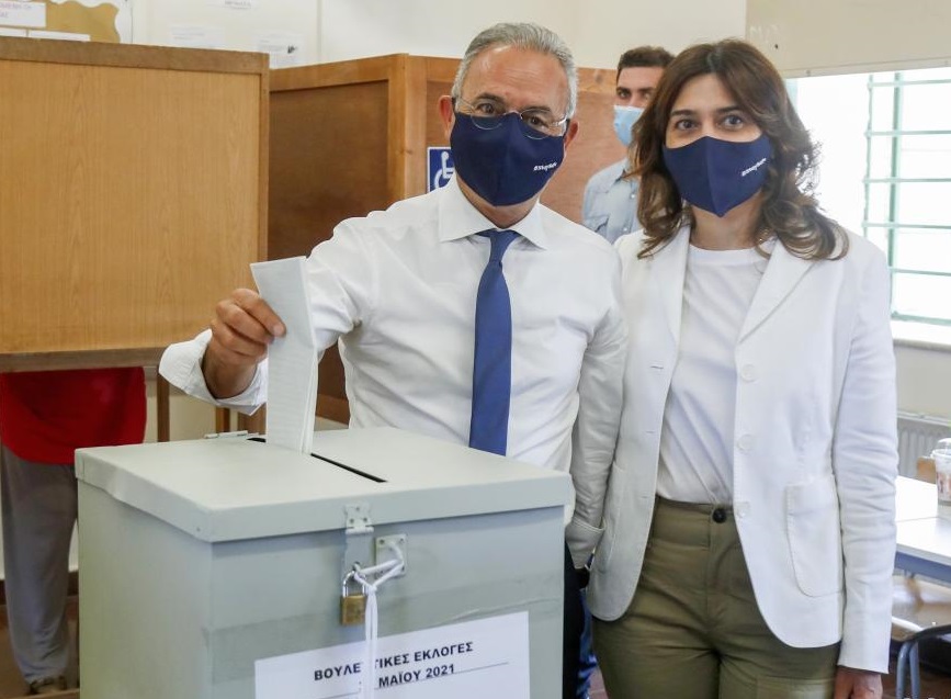 5月30日,塞浦路斯民主大會黨領導人、候選人內奧菲圖(左)在首都尼科西亞的一處投票站投票。