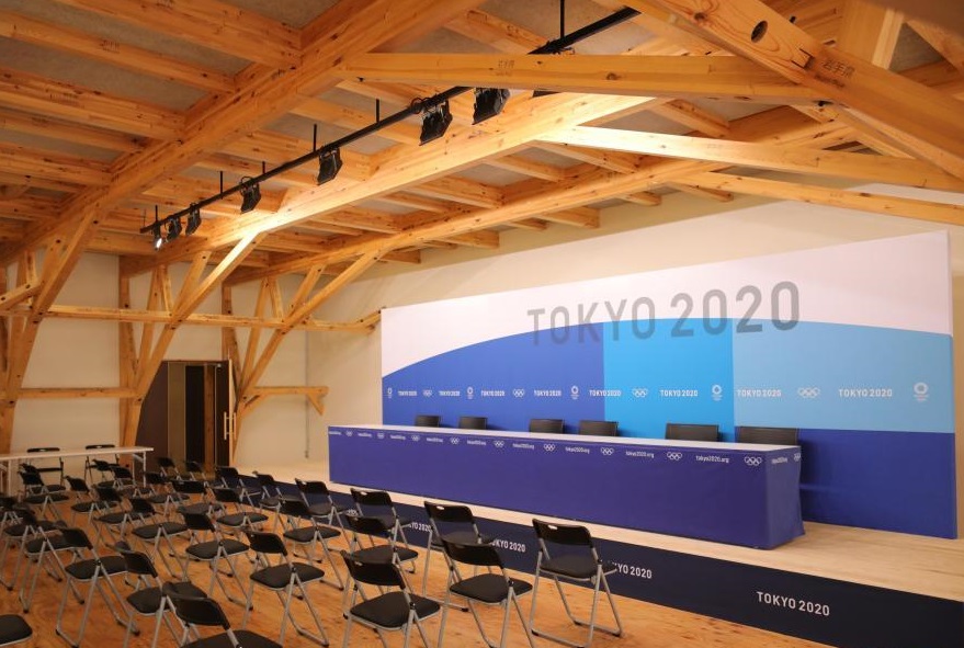 這是6月20日在東京奧運(yùn)會奧運(yùn)村內(nèi)拍攝的新聞發(fā)布廳。