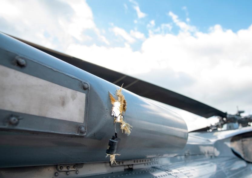 這是6月25日在哥倫比亞東北部北桑坦德省省會庫庫塔拍攝的哥倫比亞總統(tǒng)杜克所搭乘的直升機上的槍孔。