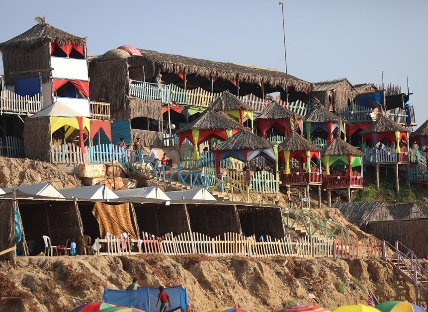 人民網(wǎng)訊 當(dāng)?shù)貢r(shí)間2021年6月25日,巴勒斯坦Deir al-Balah,當(dāng)?shù)鼐用裥∧疚葜懈╊刂泻:瑯?lè)享夏日時(shí)光。海灘是這個(gè)城市為數(shù)不多開(kāi)放的公共空間之一。