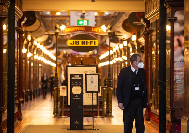 7月5日,一名男子戴著口罩站在澳大利亞悉尼市中心的一家商場(chǎng)門(mén)口。