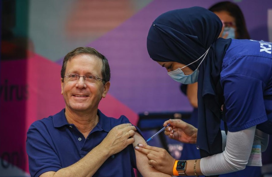 7月30日,以色列總統(tǒng)赫爾佐格(前左)在拉馬特甘接種第三劑新冠疫苗。