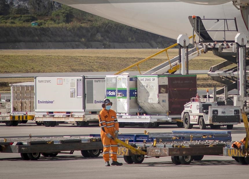 8月3日,工作人員在厄瓜多爾首都基多蘇克雷國際機(jī)場(chǎng)轉(zhuǎn)運(yùn)新冠疫苗。
