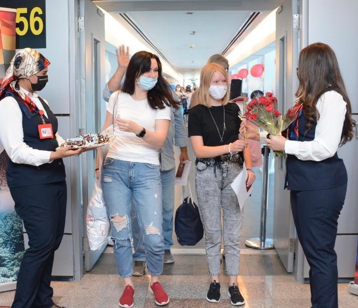 8月9日,機(jī)場工作人員在埃及紅海城市胡爾加達(dá)一機(jī)場歡迎抵達(dá)的俄羅斯旅客。