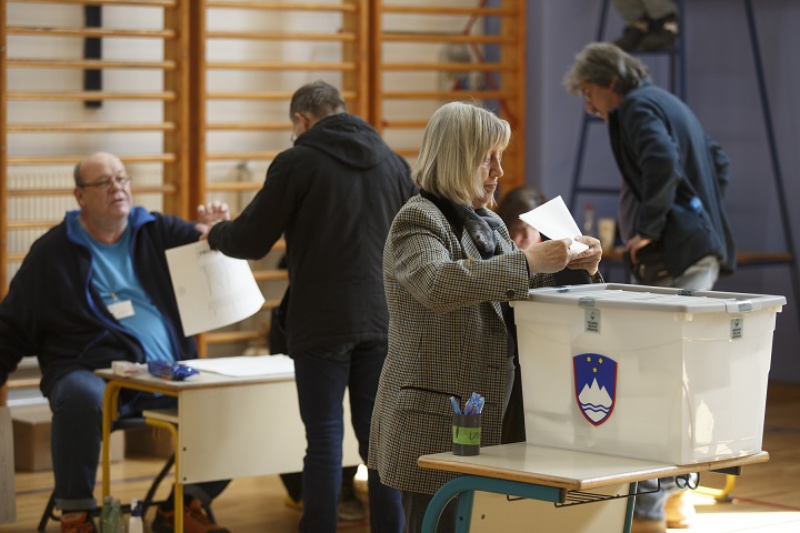 4月24日,在斯洛文尼亞首都盧布爾雅那的一處投票點,選民參加議會選舉投票。