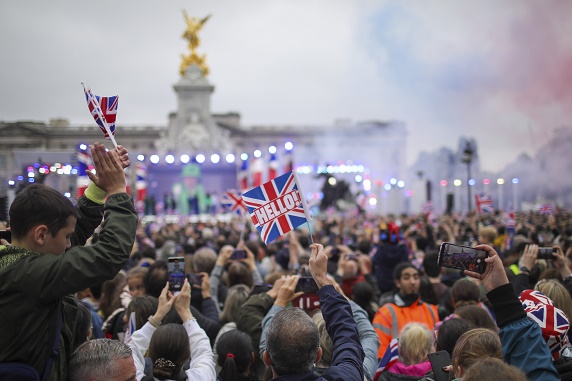 6月5日,在英國倫敦,人們在花車游行結(jié)束后聚集在白金漢宮前。