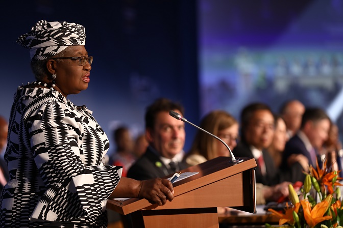 6月12日,世界貿(mào)易組織總干事伊維拉(前)在瑞士日內(nèi)瓦舉行的世貿(mào)組織第12屆部長(zhǎng)級(jí)會(huì)議開幕式上致辭。