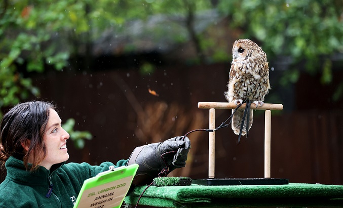 圖為25日,在英國倫敦動(dòng)物園,工作人員為一只貓頭鷹稱重。 新華社記者 李穎 攝