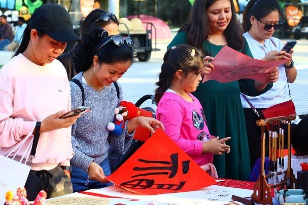 迪拜世博城迎來2023“歡樂春節(jié)”大巡游。圖為1月14日,在阿聯(lián)酋迪拜世博城,人們在中國·自貿(mào)試驗區(qū)開封片區(qū)搭建的“歡樂春節(jié)”非遺廟會專題展位欣賞書法作品。    新華社發(fā)