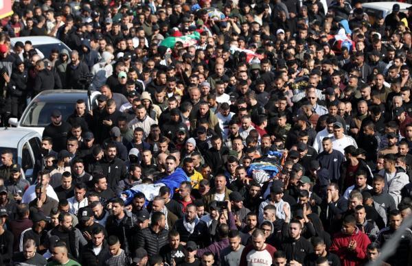 圖為1月26日,人們在約旦河西岸城市杰寧參加被以色列軍隊打死的巴勒斯坦人的葬禮。新華社發(fā)(艾曼·努巴尼攝)