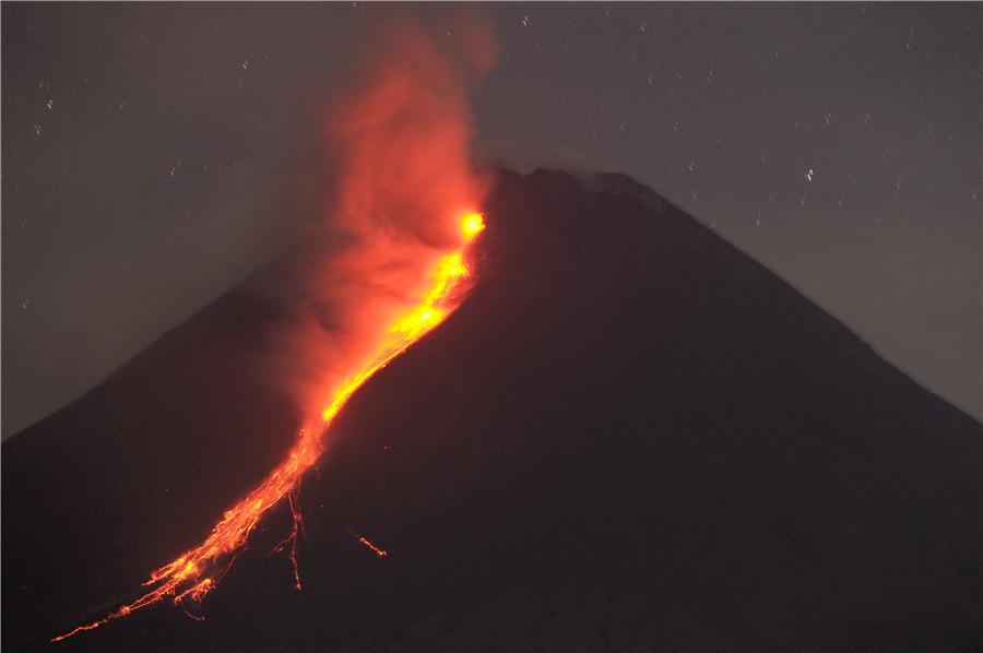 當(dāng)?shù)貢r(shí)間2023年3月18日,印尼日惹,默拉皮火山噴發(fā),熔巖流淌。