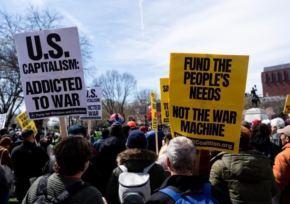 當日,數(shù)百名反戰(zhàn)人士在美國首都華盛頓市白宮北側(cè)拉斐特廣場舉行集會,敦促美國政府反思伊拉克戰(zhàn)爭,呼吁美國關(guān)?!皯?zhàn)爭機器”。