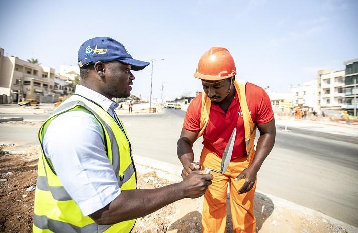 5月13日,蘇信(左)在塞內(nèi)加爾達(dá)喀爾快速公交項目建設(shè)工地與同事交流。新華社記者 李亞輝 攝