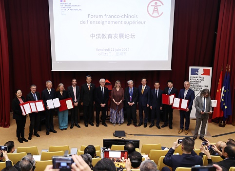 6月21日,中國(guó)教育部與法國(guó)高等教育和科研部在法國(guó)巴黎共同舉辦首屆中法教育發(fā)展論壇。中國(guó)教育部部長(zhǎng)懷進(jìn)鵬(左六)與法國(guó)高等教育和科研部部長(zhǎng)勒塔約(右七)共同出席論壇并致辭。新華社記者 高靜 攝