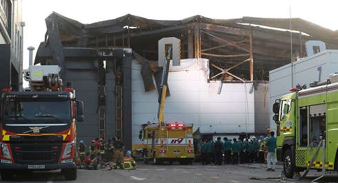 6月24日,救援人員在韓國京畿道華城市電池制造企業(yè)工廠火災現(xiàn)場搜救。新華社記者 姚琪琳 攝