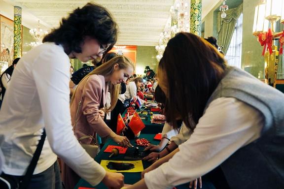 中俄兩國學(xué)生攜手奉獻(xiàn)了一場精彩的中國文化展演。民樂合奏《云宮迅音》、短劇《西游記之三打白骨精》、詩朗誦《沁園春?雪》、武術(shù)《武魂》和歌曲《嘻唰唰》《夢想從心開始》以及精彩互動,充分展現(xiàn)了同學(xué)們中文學(xué)習(xí)成果和對中國文化的理解。書法、剪紙、雕版印刷、民族服飾等15個中華文化體驗展臺,吸引同學(xué)們紛紛駐足??绝?、肉夾饃等中國小吃讓來賓體驗到中國飲食文化的豐富多彩。