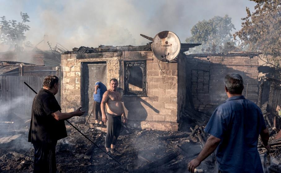 圖為當(dāng)?shù)貢r間2025年7月16日,烏克蘭康斯坦丁尼夫卡,俄羅斯炮擊該市后,烏克蘭平民試圖撲滅一處房屋火災(zāi)。 CFP供圖