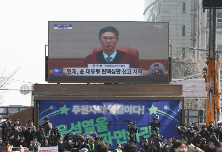 4月4日,民眾在韓國(guó)首都首爾的韓國(guó)憲法法院附近觀看尹錫悅彈劾案宣判過程的電視直播。新華社記者姚琪琳攝