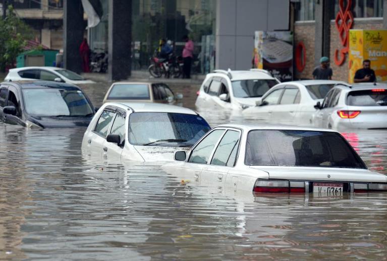 8月19日,在巴基斯坦南部港口城市卡拉奇,暴雨過后車輛浸泡在積水中。新華社發(fā)