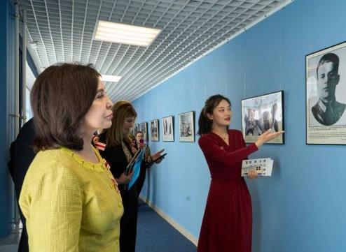 9月2日,在俄羅斯符拉迪沃斯托克舉辦的“百煉成鋼的真心朋友”——紀(jì)念中國(guó)人民抗日戰(zhàn)爭(zhēng)暨世界反法西斯戰(zhàn)爭(zhēng)勝利80周年圖片展上,工作人員為參觀者講解。新華社發(fā)(郭飛洲攝)
