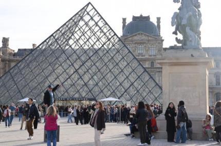 2025年10月22日,在法國巴黎,大量游客聚集在盧浮宮博物館的玻璃金字塔入口前。新華社記者張百慧攝