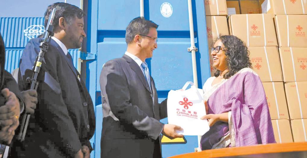 圖為戚振宏大使和斯里蘭卡總理阿馬拉蘇里亞在捐贈儀式現(xiàn)場。