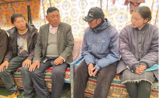 “全國(guó)模范人民調(diào)解員”扎西次加(左二)在西藏自治區(qū)那曲市比如縣恰則鄉(xiāng)孔瑪奪村蟲草采集點(diǎn)向群眾宣講法律知識(shí)。