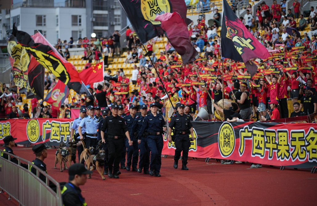 每逢平果市主場比賽日,各地球迷都會早早來到體育場外為球隊吶喊助威。而比球迷更早到達(dá)的,是平果市公安局的民輔警和安保人員。“每場比賽前,民警會提前4個小時到達(dá)現(xiàn)場開展安全排爆工作。場內(nèi)近3萬個座位、每一條過道、每一個看臺,以及場外的每一個重點區(qū)域,我們都要認(rèn)真排查?!逼焦泄簿指本珠L黃漢杰說。