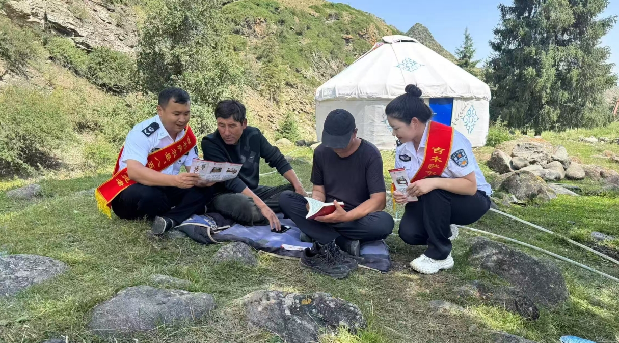 7月14日,新疆吉木薩爾縣司法局“馬背普法隊”成員騎馬來到草原深處的牧業(yè)點開展普法宣傳活動。司法局干警將法條編成牧民熟悉的諺語,將案例融入日常聊天,在轉(zhuǎn)場路上設(shè)立“移動普法站”,在牧場開設(shè)“氈房法律課堂”,讓尊法學(xué)法守法用法的種子在每一片草原、每一戶牧民心中生根發(fā)芽。