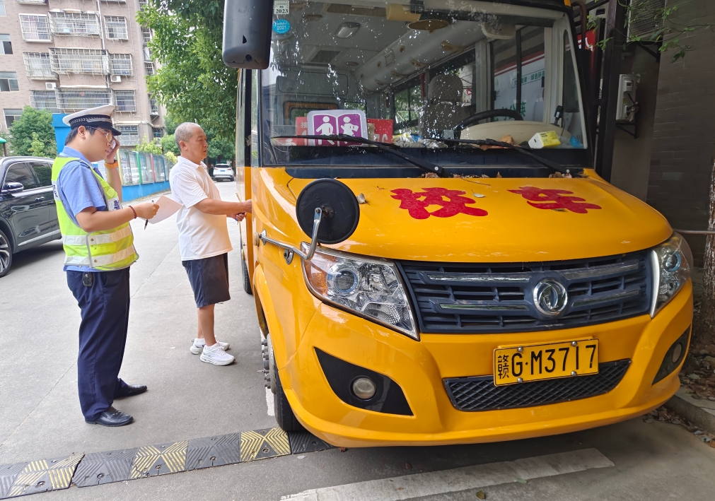 圖為8月28日,民警對(duì)轄區(qū)幼兒園校車(chē)進(jìn)行安全檢查。