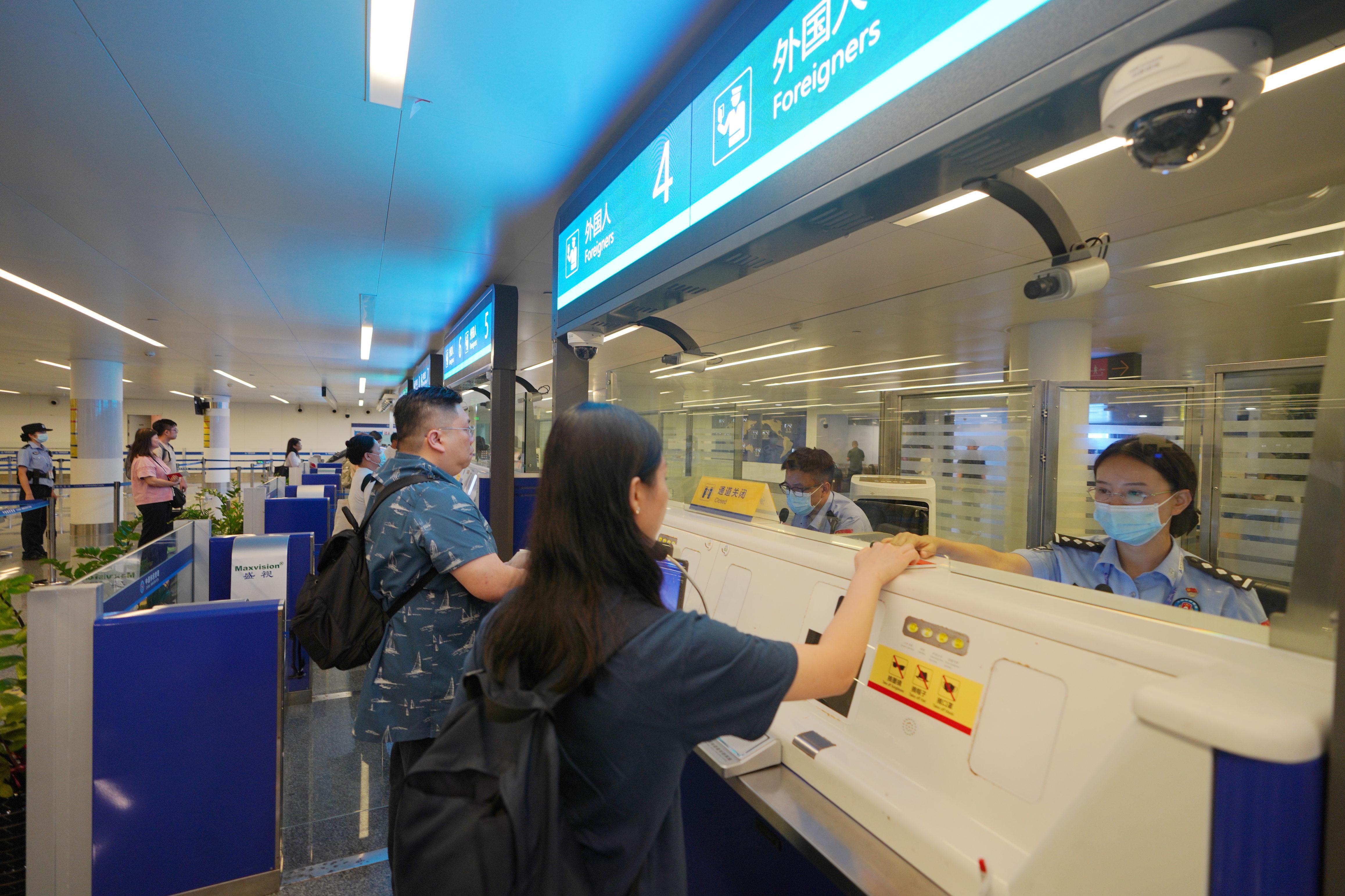 圖為“朱槿花服務隊”隊員對入境的參展客商進行證件查驗。梁簫 攝
