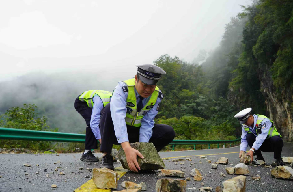 圖為路焰(前)和隊(duì)友清理轄區(qū)臨崖路段落石。鄒靜宇 攝