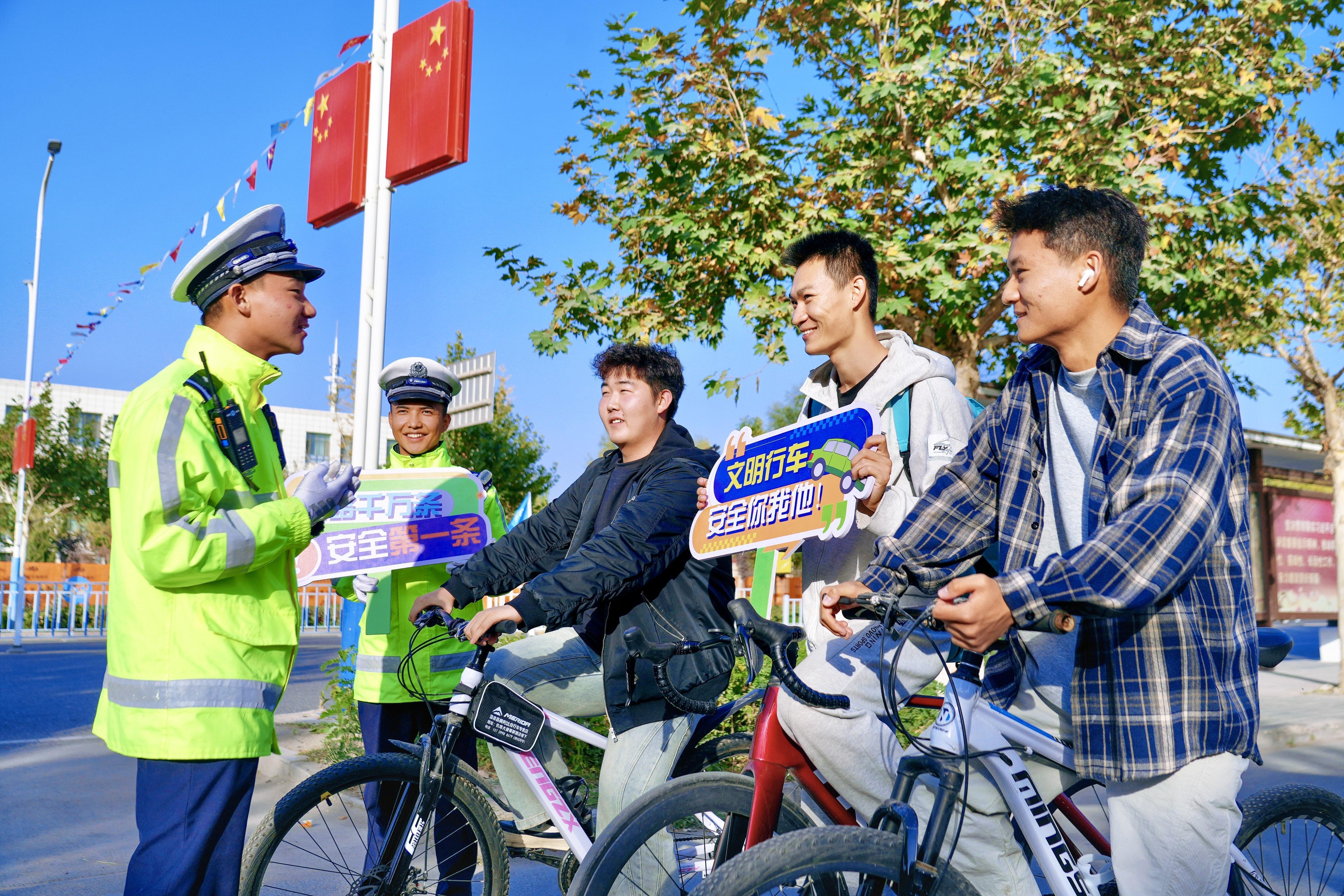 圖為10月16日,溫宿縣公安局交通管理大隊民警向新疆理工學院學生普及文明騎車相關(guān)知識,引導學生切勿逆向行駛。