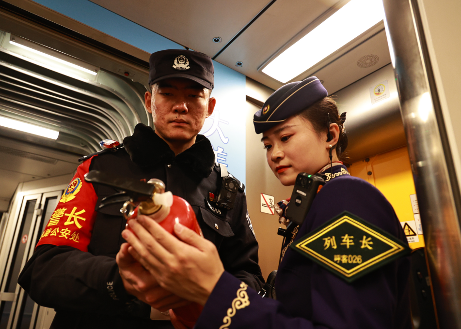 圖為首發(fā)列車(chē)乘警張?bào)K昂與列車(chē)長(zhǎng)共同開(kāi)展消防安全隱患排查。