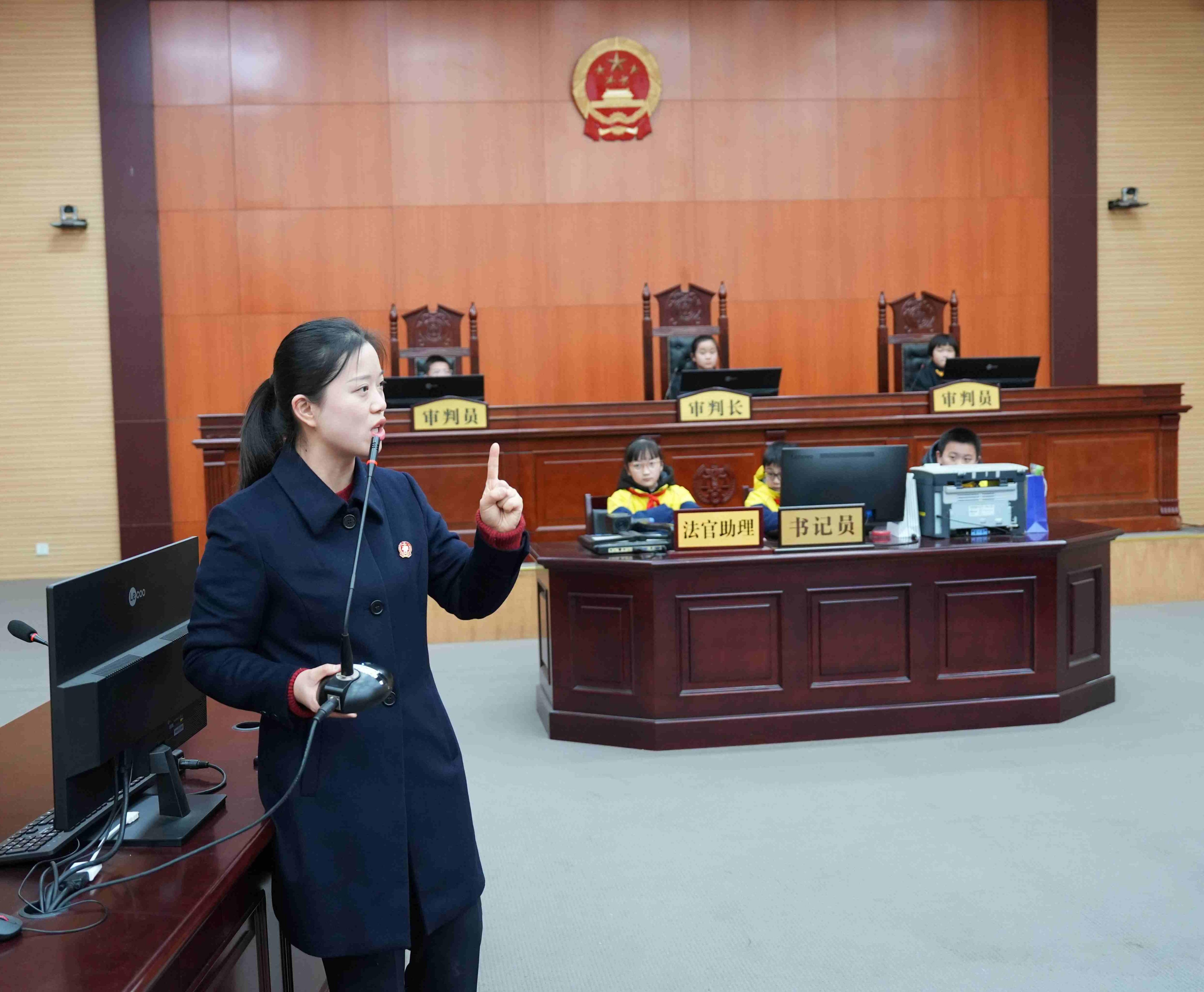 圖為法院干警、孝感市實(shí)驗(yàn)小學(xué)法治副校長(zhǎng)陳露為學(xué)生們講解法院審判規(guī)則。